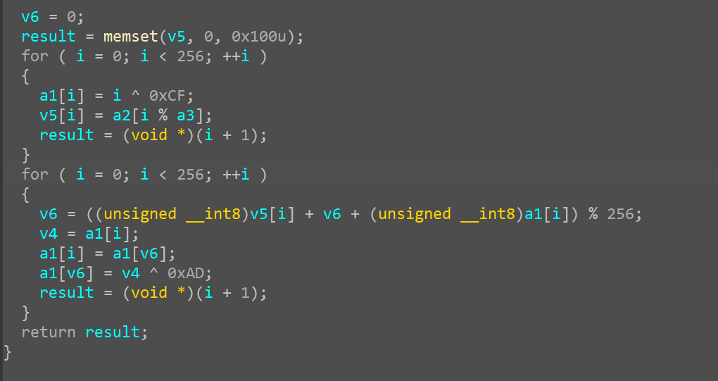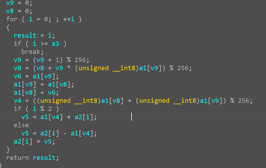 for (int i = 0; i < 10; ++i) { w[4] = w[0] ^ MIX(w[3]) ^ rcon[i]; w[5] = w[1] ^ w[4]; w[6] = w[2] ^ w[5]; w[7] = w[3] ^ w[6]; w += 4; }